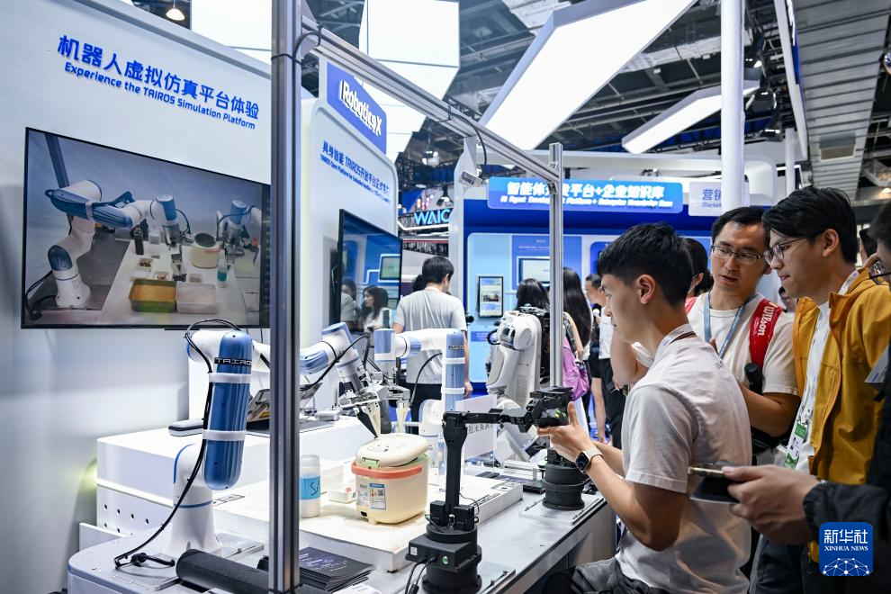 正正在上海举行的2025世界人工智能大会展览现场,一个具备文字识别自从分拣随机物品功能的双臂机械人正在向参不雅者做演示。仿佛置身未界,仿佛置身未界,正正在上海举行的2025世界人工智能大会展览现场,腾讯展区工做人员(左)正在向参不雅者展现具身智能平台Tairos。